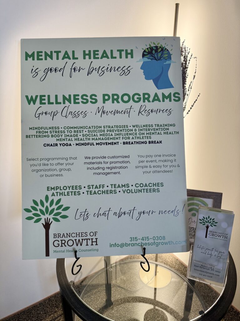 With counseling offices in North Syracuse and East Syracuse, Branches of Growth offers both in-person and telehealth services for individuals, couples, and families. Their holistic approach focuses on mental, emotional, and physical wellness, creating a welcoming space for healing, growth, and balance — whether at home, work, or within the community.